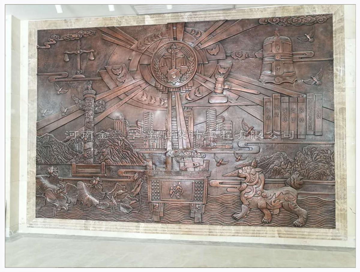 法院背景墻浮雕因為裝飾需求,大堂浮雕墻在法院背景墻浮雕的裝飾中運用較多,浮雕質感古樸典雅,大方美觀,